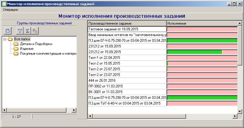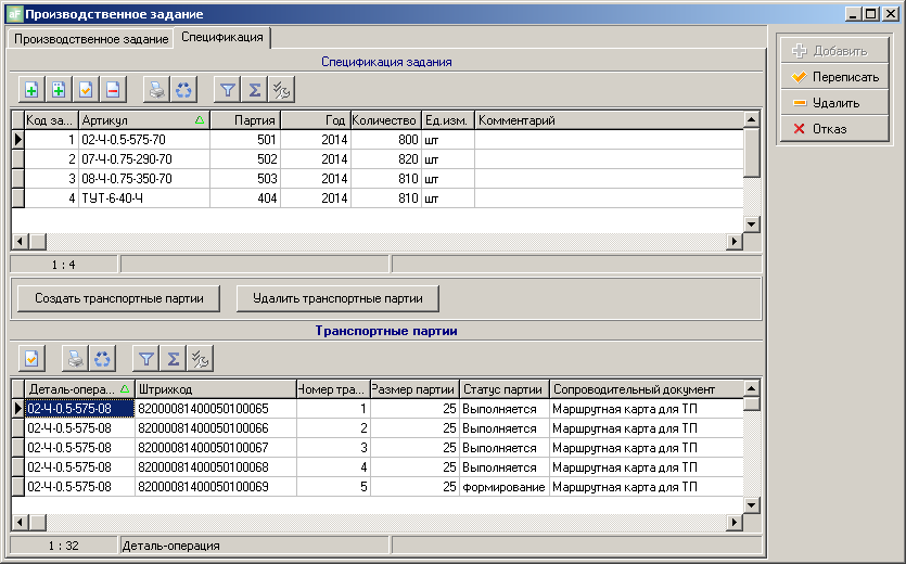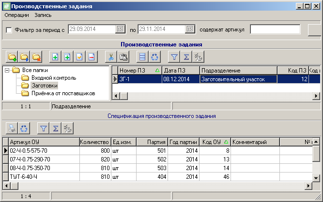 Производственные задания (ПЗ) - основной документ АИ-ПРО для подразделений (участков), список которых содержится в отдельном журнале в виде древовидного списка. Спецификация ПЗ может формироваться автоматически, на основании плановых документов верхнего уровня (например, импортируемых из «1С») или из справочника ОУ с указанием количества по каждому наименованию. В ПЗ определяются производственные партии (ПрП). Для каждой производственной партии может быть уточнён маршрутный техпроцесс на основании базового. Для каждой ПрП автоматически формируются транспортные партии (ТрП), т.е. минимальные порции от ПрП, которые могут перемещаться для выполнения следующих операций, не дожидаясь окончания выполнения операции над всей ПрП. |