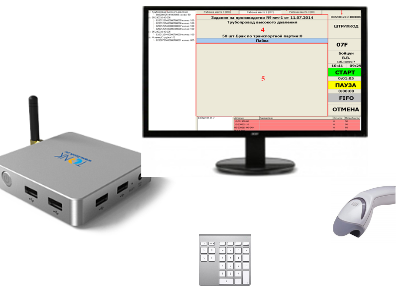 Состав: Сервер АИ-ПРО, АРМ администратора, АРМ технолога, АРМ диспетчера, АРМы основных и вспомогательных рабочих - стационарные и мобильные регистраторы Стационарные регистраторы устанавливаются на рабочие места выполнения технологических операций и состоят из «тонкого клиента», монитора, цифровой клавиатуры и ручного сканера штрихового кода. Рабочий лично заинтересован в регистрации своих действий, т.к. на основании этих данных определяется его фактическая выработка и начисляется зарплата! С помощью мобильного регистратора выполняются перемещения ОУ по адресам, инвентаризация, комплектация заказа под отгрузку и отгрузка и пр. вспомогательные операции. Используется беспроводная сеть Wi-Fi для обмена данными между устройствами и сервером АИ-ПРО. |