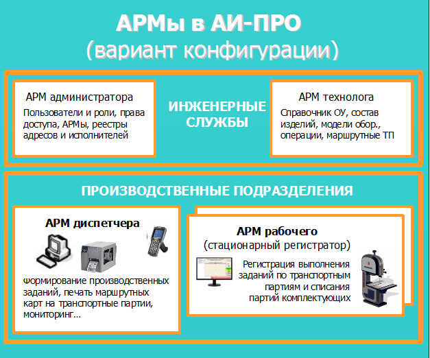 Сервер АИ-ПРО, АРМы администратора, технолога, диспетчера. АРМы основных и вспомогательных рабочих - стационарные и мобильные регистраторы. Более подробно… |