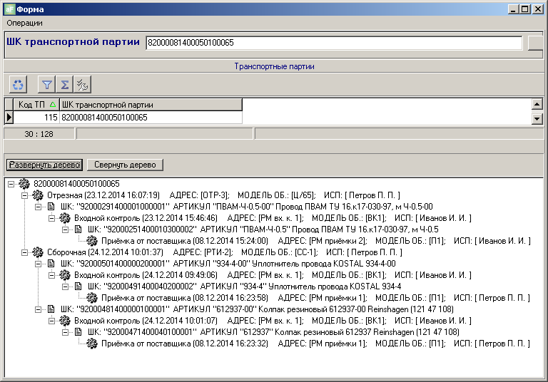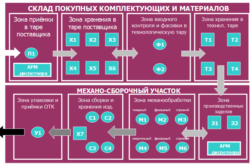 Структура производства содержит головные подразделения, производственные участки, зоны, адреса хранения ОУ и адреса выполнения операций над ОУ. В подразделениях назначаются адресные изоляторы брака. Для каждого адреса распечатывается ШК идентификатор, которым маркируется соответствующее рабочее место. Реестр исполнителей содержит список основных рабочих с правами выполнения тех или иных операций. Для каждого исполнителя распечатывается ШК идентификатор в виде бейджа. |