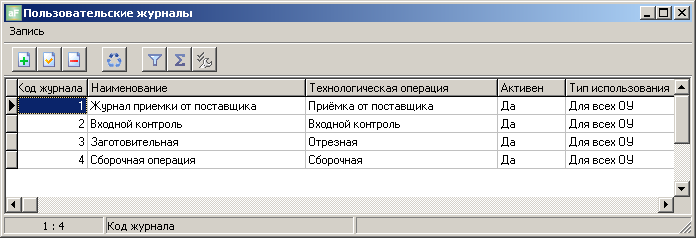 Журналы документов – системные и пользовательские. Системные формируются автоматически и содержат первичные документы по перемещению, инвентаризации, списанию ОУ и пр., (регистрация с помощью мобильных терминалов). Пользовательские – формирует и настраивает пользователь, содержат первичные документы по выполненным технологическим операциям на основании производственных заданий (на стационарных регистраторах). Ещё есть журналы производственных заданий и регистрации брака. |