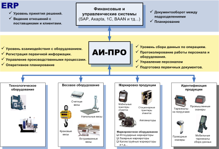 АИ-ПРО в иерархии управления предприятием:АИ-ПРО является источником достоверных данных для формирования первичных документов. Финансовые и управленческие системы верхнего уровня могут использовать эти данные. Своевременная и достоверная первичная информация – основа эффективной работы любой учётной системы! |